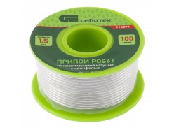 Припой с канифолью, D 1,5 мм, 100 г, POS61, на пластмассовой катушке Сибртех СИБРТЕХ 913377