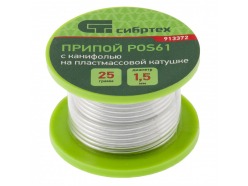 Припой с канифолью, D 1,5 мм, 25 г, POS61, на пластмассовой катушке Сибртех СИБРТЕХ 913372