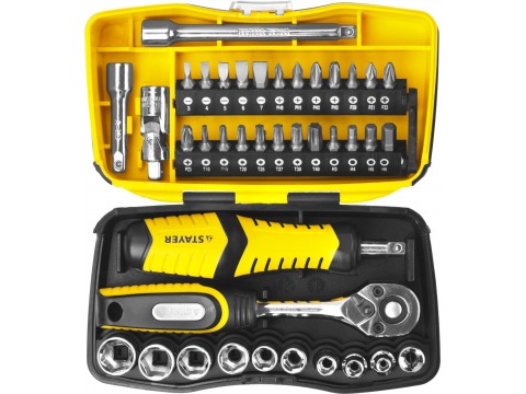 Набор бит и торцовых головок STAYER серии "Professional" изготовлен из высококачественной инструментальной стали и предначзначен для монтажа и демонтажа резьбовых соединений.