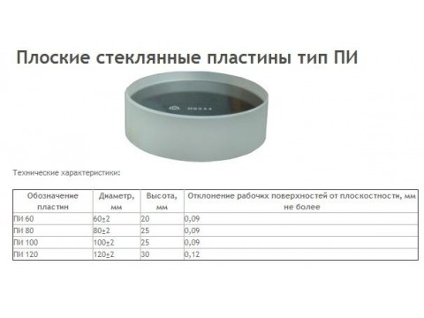 Пластины плоские стеклянные ПИ 60, ПИ 80, ПИ 100, ПИ 120. В зависимости от назначения устанавливаются два типа плоских стеклянных пластин: нижние и верхние. Нижние (опорные) пластины применяются для притирания к ним плоскопараллельных концевых мер длины при интерференционных измерениях, а также для поверки плоскостности измерительных поверхностей концевых мер, калибров, измерительных приборов и инструментов. Верхние пластины применяются для измерения плоскопараллельных концевых мер длины техническим интерференционным методом. Нижние пластины выпускаются диаметром 60, 80, 100 и 120 мм. В зависимости от диаметра пластины обозначают: ПИ 60, ПИ 80, ПИ 100, ПИ 120. Верхние пластины выпускаются только диаметром 60 мм . Пластины обозначаются ПИ 60 верхние.